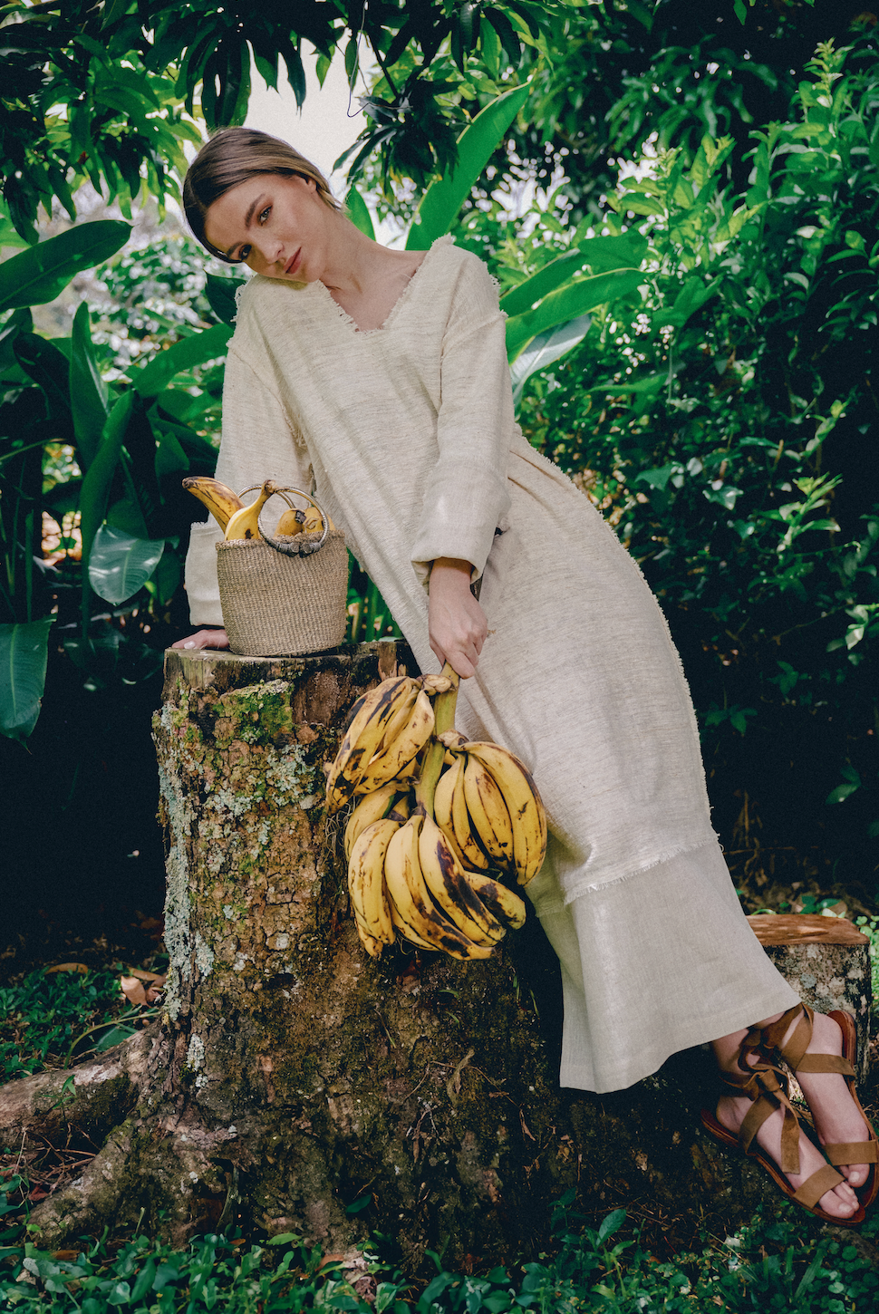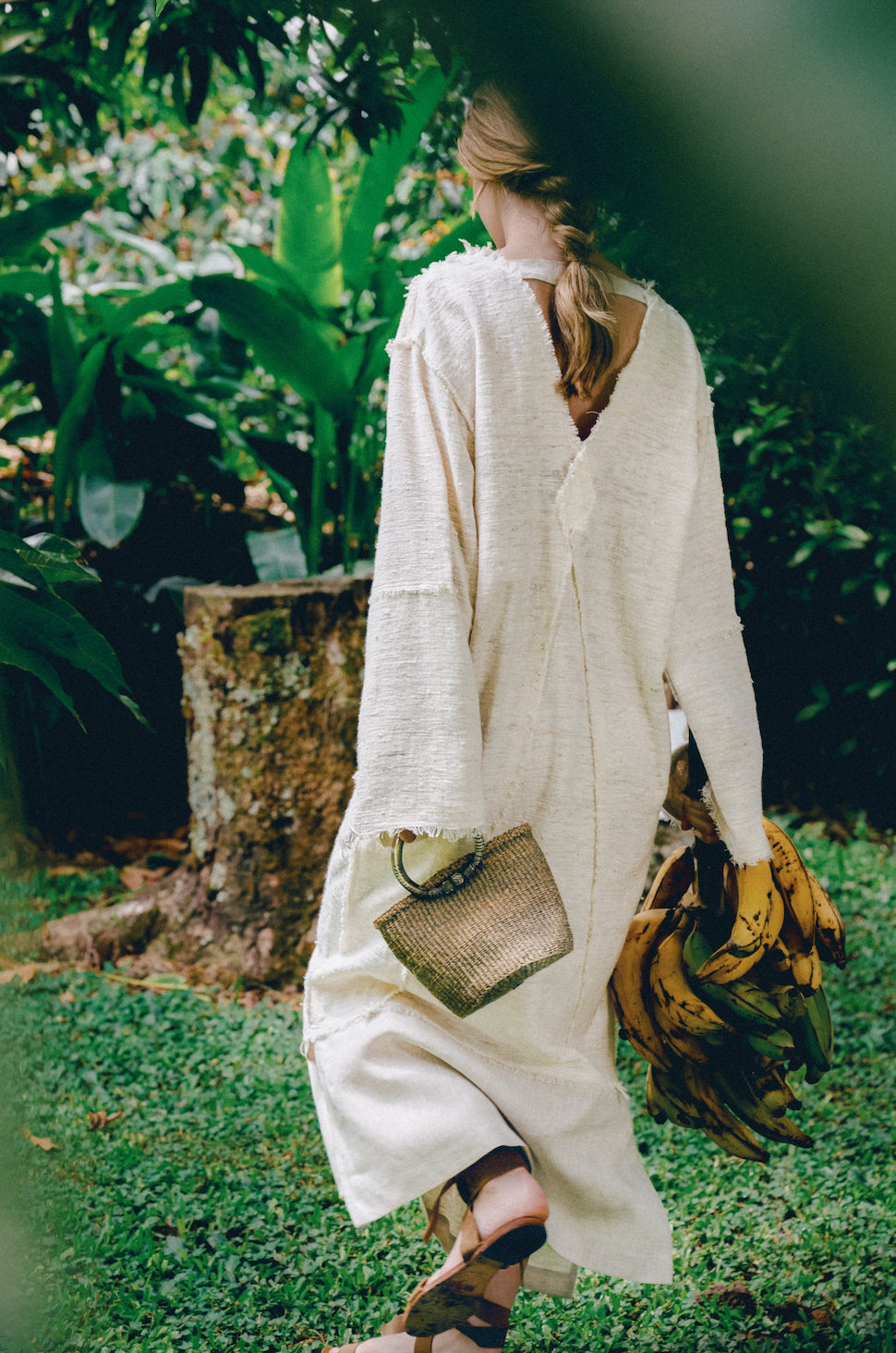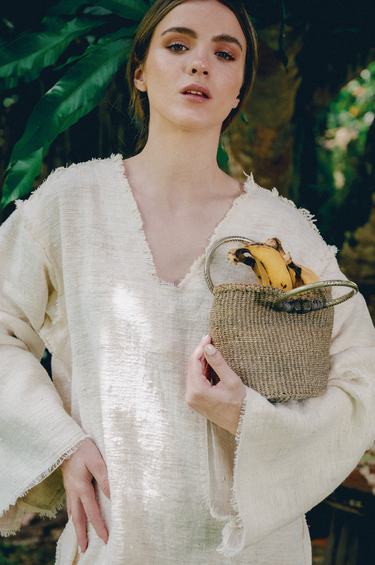 The Fruit of the Earth Dress is a flowing maxi dress that blends artisanal craftsmanship with natural elegance. Made from handwoven cotton, tightly loomed by artisan women in Kenya, the fabric has a beautifully textured, organic feel that speaks of time, care, and tradition. This version is elevated with 100% linen detailing in a soft natural tone, used inside the sleeves and along the wide hem, adding weight, contrast, and a refined finish. The long, wide sleeves can be worn loose or pulled up to reveal the linen lining, tied with delicate strings adorned with recycled glass beads from Ghana.