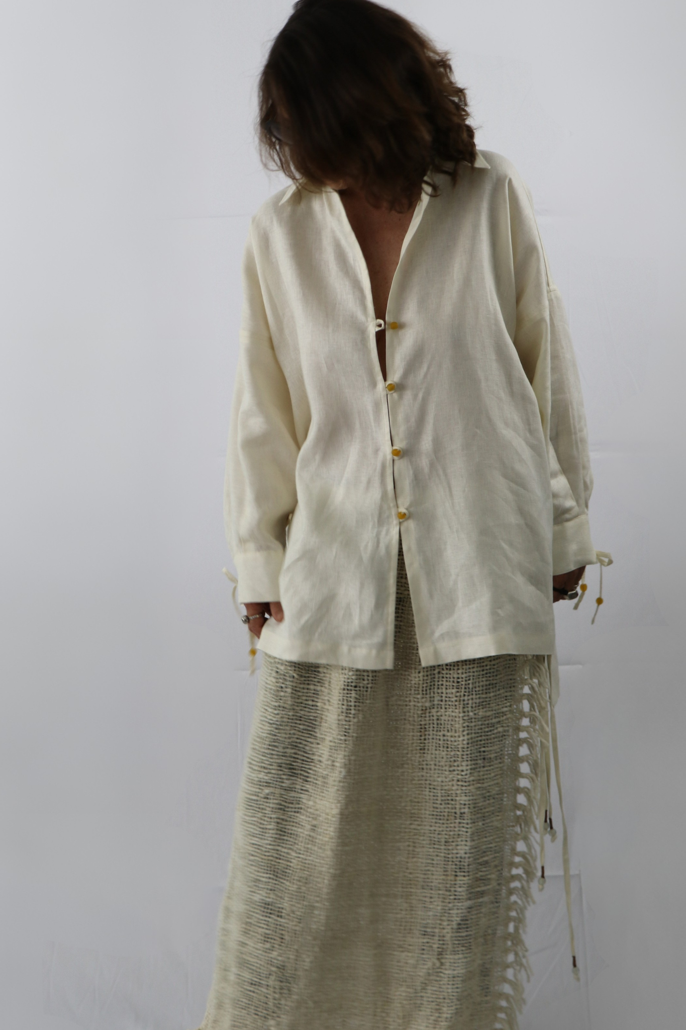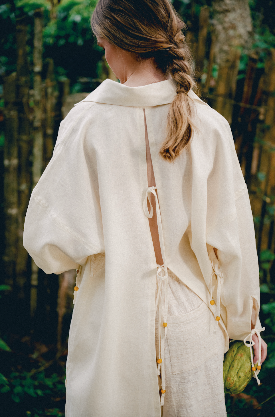 Effortlessly sensual and boldly detailed, the La Fruta Blouse is a refined take on the classic boyfriend shirt. Made from 100% linen, this blouse features a structured, slightly oversized neckline and a deep front opening, where the button placket begins low to create a plunging neckline. Longer in the back for a fluid, flattering silhouette, the blouse offers comfort and edge in equal measure.